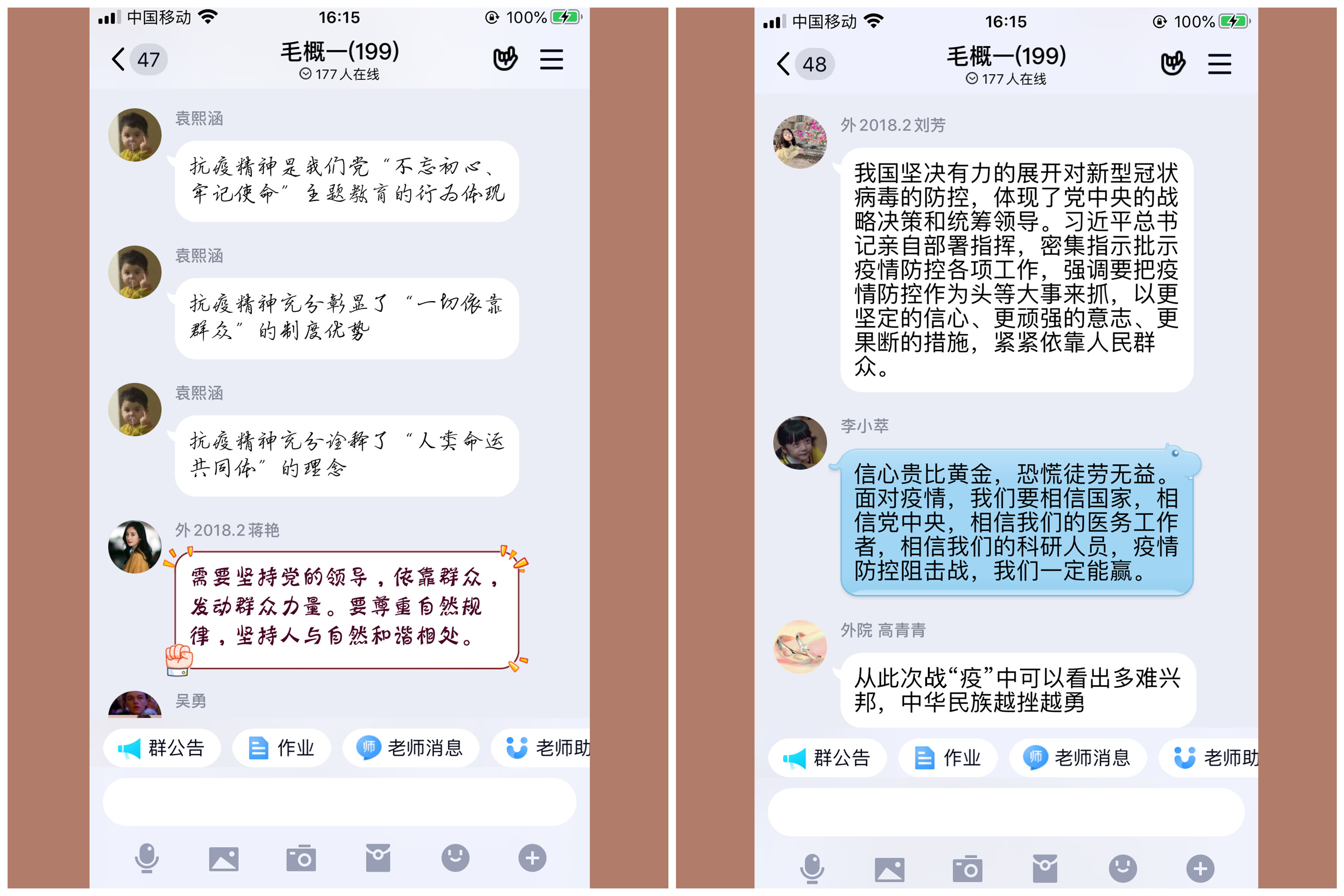 马克思主义学院党总支书记刘春辉说,“收看了四位教授的精彩讲解后,作为党总支书记、作为一名‘概论课’教师,我颇受启发,我们可以充分利用疫情所呈现的典型事例和素材对当代大学生进行铸魂教育,在今后的思政课堂上应该贯穿讲好中国道路自信、爱国主义、敬畏生命、责任担当、大爱与感恩、乐观主义和人类命运共同体等思政‘内核’。”