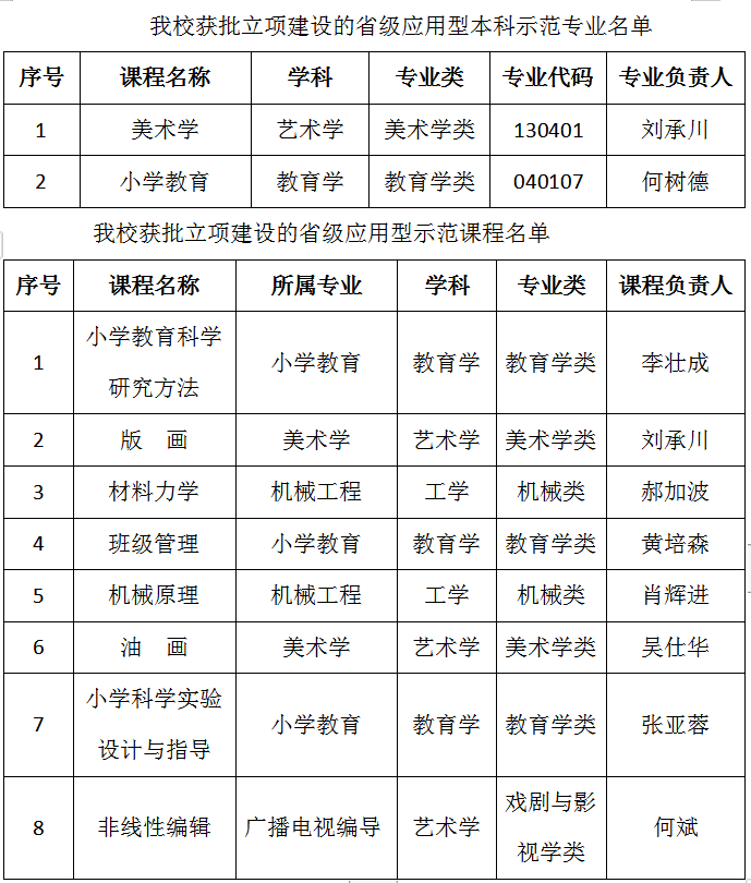 2019年1月中旬,四川省教育厅发布《关于立项建设第二批地方普通本科高校应用型示范专业及应用型示范课程的通知》(川教函〔2019〕31号),ac米兰美术学(专业代码130401)、小学教育(专业代码040107)两个应用型本科示范专业和小学教育科学研究方法、版画、材料力学等8门应用型示范课程获批立项建设。获批立项建设的省级应用型本科示范专业和应用型示范课程,对进一步提升ac米兰专业品质和专业服务能力,提高课程建设质量,深化产教融合,增强学校培养“三心四能五复合”应用型复合型人才和服务区域经济社会发展能力具有积极意义。