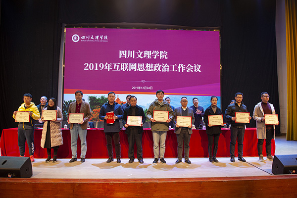 校领导为2019年校内优秀新媒体平台、指导教师、网络评论员、学生骨干颁发奖牌及证书。