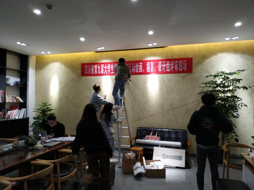 布置四川省第九届大学生艺术展演活动绘画、摄影、设计组评审现场