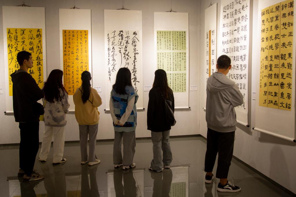 在艺术作品展区,110多幅国画、油画、版画、漆画、装饰画等绘画作品以现实生活为创造题材,表现内容丰富,形式多样,线条优美,构思新颖,栩栩如生,生动反映了新时代主题和当代大学生的审美意趣与价值取向。书法类作品行楷草隶书兼具,或行云流水,或潇洒飘逸,或苍劲有力,或大气磅礴,既继承了名家风范,又融入现代创新,展现了中华优秀文化瑰宝的时代韵味和当代审美价值。设计类、摄影类作品创意新颖,主题突出,时代感、现实感强烈,吸引了众多嘉宾驻足观赏。