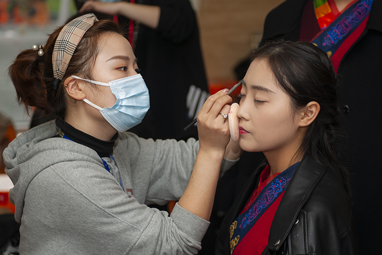 志愿者为参演学生化妆
