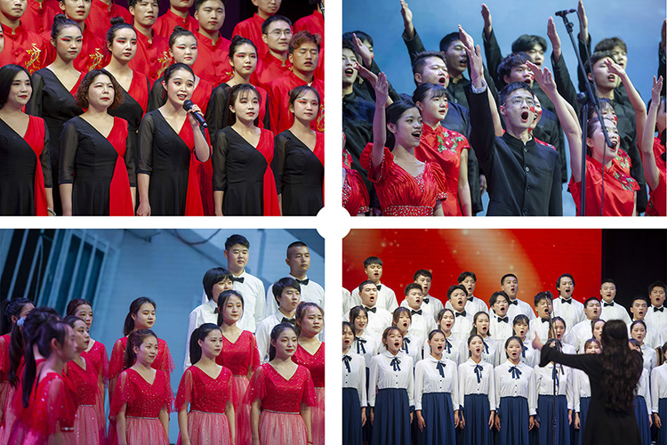 在歌会中,康养产业学院带来的《我和我的祖国》、智能制造学院带来的《旗帜颂》、体育学院带来的《爱我中华》、马克思主义/政法学院带来的《春天的故事》、美术学院带来的《听妈妈讲过去的事情》、建筑工程学院/生态旅游学院带来的《在灿烂的阳光下》、数学学院带来的《江山》、 财经管理学院带来的《不忘初心》、外国语学院带来的《十送红军》、音乐与演艺学院带来的《追寻》纷纷结合歌曲反映的主题、表达的思想情感和学院自身特色,借助多样的表演形式和艺术性的演唱技巧,唱出了文理青年朝气蓬勃、昂扬向上的精神风貌,唱出了文理青年传承五四精神、发扬革命精神、延续红色精神的意志品格,唱出了文理青年与共产党同行、与祖国同行、与人民同行,建功新时代的远大志向。歌会在全体齐唱《走向复兴》中圆满落幕。