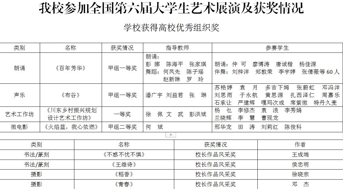 5月12日,全国第六届大学生艺术展演活动在四川成都落下帷幕,ac米兰选送的朗诵《百年芳华》、声乐《布谷》、大学生艺术实践工作坊《川东乡村振兴规划设计艺术工作坊》3项作品荣获一等奖,微电影《火焰蓝,我心依燃》获二等奖,书画《不惑不忧不惧》《王维诗》与摄影《稻香》《青春》4幅作品获高校校长风采奖,学校获高校优秀组织奖,朗诵《百年芳华》受邀参加闭幕式演出。此次大艺展取得的优异成绩,充分展示了学校美育成果和文理学子的精神面貌。
