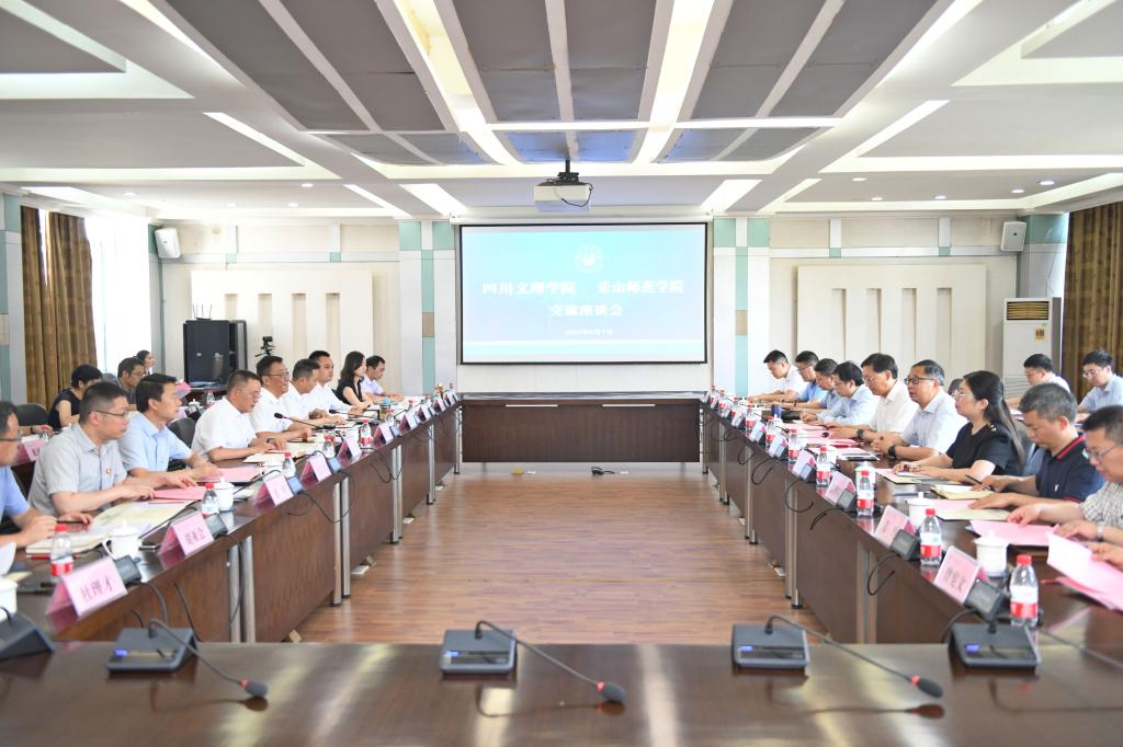 6月7日下午,党委书记王成端、校长刁永锋一行来到乐山师范学院交流座谈。乐山师范学院党委书记胡丹介绍了该校的历史沿革、办学条件及办学成就。他表示,两校发展历程相似,渊源深远,希望进一步加强交流与合作,优势互补,不断完善治理体系,提升治理水平。乐山师范学院校长刘进希望合作更加紧密,取长补短,推动两校共同进步。