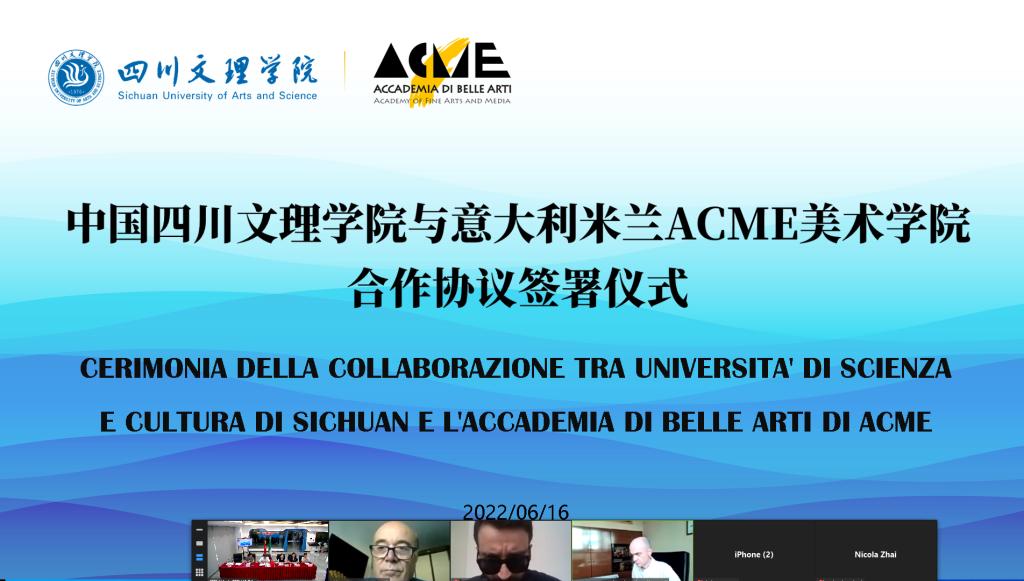 6月16日,学校与意大利米兰ACME美术学院举行校际合作线上签约仪式。校长刁永锋、副校长程碧英、美术学院院长刘承川、国际交流合作处处长李锣,意大利教育部国际交流合作司司长Giuseppe Marucci、米兰ACME 美术学院院长Pietro Previde Prato、院长助理Jacopo Melzi共同出席签约仪式,签约仪式由程碧英主持。