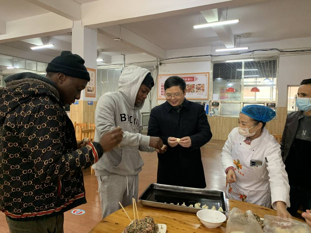 学校领导与留校学生一起包饺子