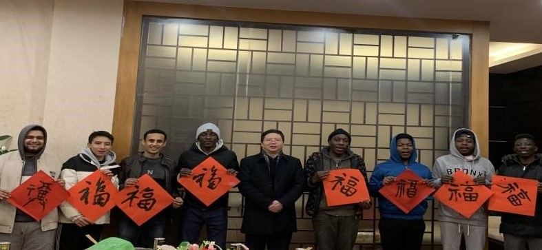 在看望留学生时,侯忠明还为留校的国际留学生每人现场书写并赠送了一幅喜庆的“福”字,向全体留学生表达了中国式的新春问候和衷心祝福。同时他还向留学生讲解了春节的意义以及汉字的起源和历史,从甲骨文到小篆、隶书、楷书、魏碑、行书、草书,再到现代的简体字,一个汉字就能写出几十种变化,也承载着几千年中国文化发展的历程。“福”字汇聚成红色海洋,温暖、鼓励着每一位学子。留学生们纷纷表示虽然身处异乡,但感受到了中国春节的欢乐和中华优秀传统文化的精深美好,要好好珍惜在中国的留学机会,努力学好中文和专业知识,为中外友好交流、促进各国友谊作出自己应有的贡献。
