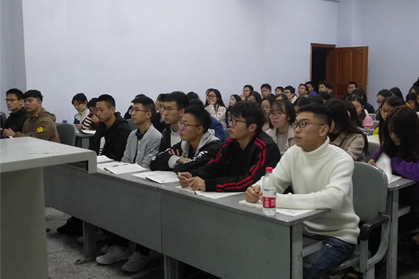11月12日晚,校长刁永锋教授为财经管理学院2017级3个本科班学生讲授“坚定不移走中国特色社会主义道路”的形势与政策课。他详细地分析了中国特色社会主义道路的历史渊源和现实基础,深刻地诠释了中国特色社会主义道路的显著特点和发展要求,指出新时代要坚定不移地坚持和发展中国特色社会主义道路。课堂上,刁永锋结合时事热点,注重历史与现实结合,讲授深入浅出,语言生动风趣,内容广博深刻,说理透彻,赢得了同学们的阵阵掌声。