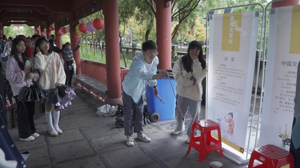 本次活动以“学习二十大,永远跟党走,奋进新征程”为主题,以“弘文励教立德树人”为根本,活动现场除了学生社团风采展示外,还开展了传统文化类学生社团互动展演及沉浸式体验活动。学校现有95个学生社团,其中传统文化类社团23个,社团成员超万人。篆刻体验、象棋对弈、茶艺展示、投壶竞技、汉服走秀、中华经典诵读、诗词飞花令互动等,一系列丰富多彩的中华传统文化活动,吸引了众多师生冒雨观赏、排队体验,激励广大师生礼敬传统、汲取智慧、传承文化,让中国优秀传统文化历久弥新、走向未来。
