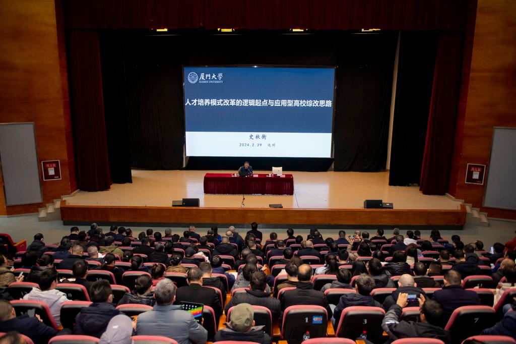 2月29日,在2024年春季“铸魂笃行”干部培训会上,厦门大学博士生导师史秋衡教授应邀为干部作“人才培养模式改革的逻辑起点与应用型高校的综改思路”专题讲座。讲座由党委副书记朱兴华主持。在家校领导和全体干部聆听讲座。