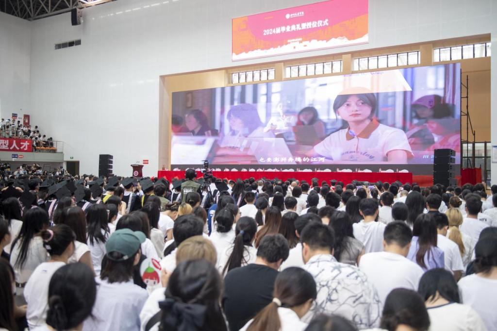 “时光的河入海流,终于我们分头走,没有哪个港口是永远的停留,……”典礼开始前,《凤凰花开的路口》《同桌的你》《祝福》《岁月神偷》《我的未来式》等暖场歌曲唤起了同学们对大学时光的美好回忆和深厚感情。伴随着熟悉的旋律,师生们陆续走进庄重而喜庆的体育馆。