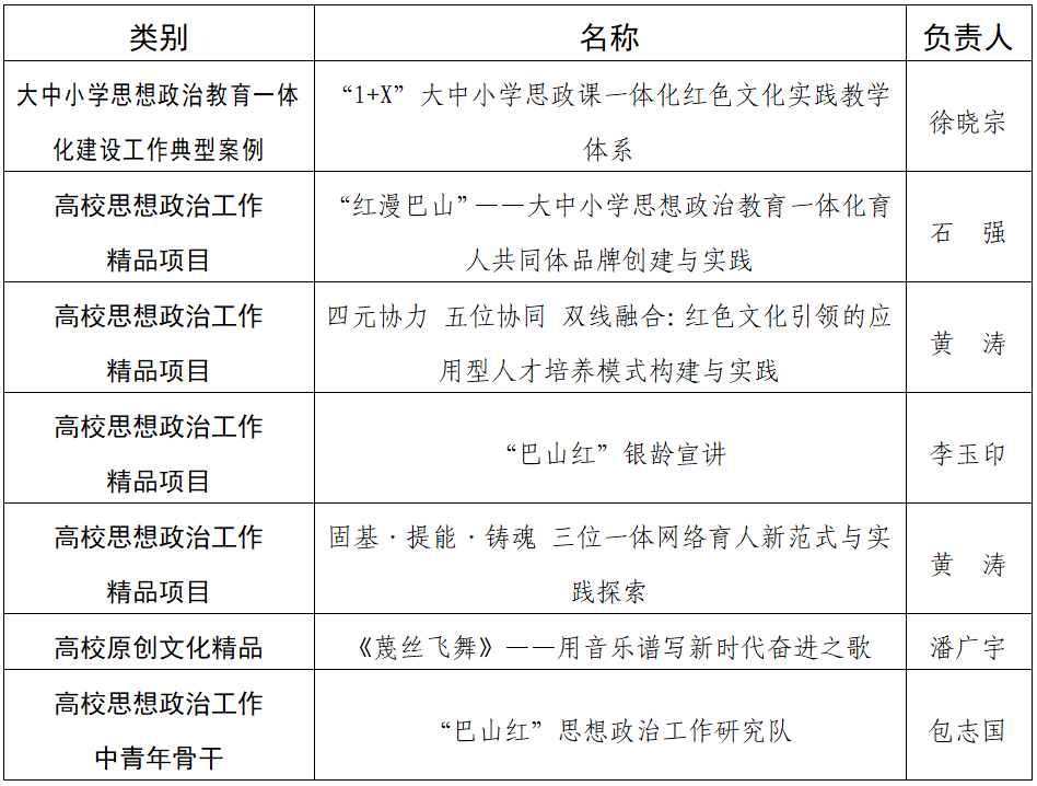 11月18日,2025年度四川省高校思想政治工作质量提升综合改革与精品建设项目入选名单公示。ac米兰获批7项,其中“高校思想政治工作精品项目”4项,“大中小学思想政治教育一体化建设工作典型案例”1项,“高校原创文化精品”1项,“高校思想政治工作中青年骨干”1项目。