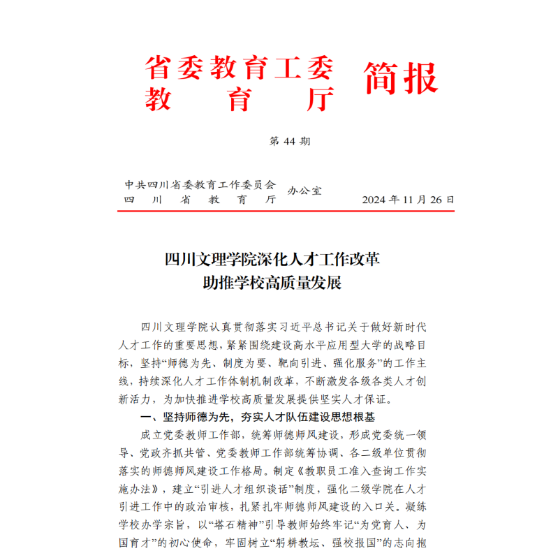 11月26日,省委教育工委 教育厅《简报》第44期以《ac米兰官网中文网站深化人才工作改革助推学校高质量发展》为题,对ac米兰进行了报道,系统介绍学校人才工作改革的经验做法及成效。