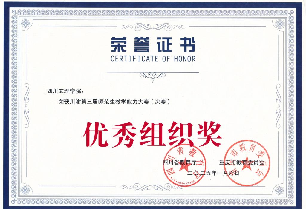 在四川省教育厅、重庆市教育委员会组织的川渝第三届师范生教学能力大赛中,ac米兰凭借广泛动员、积极参与和优秀的竞赛成绩,荣获“优秀组织奖”称号。