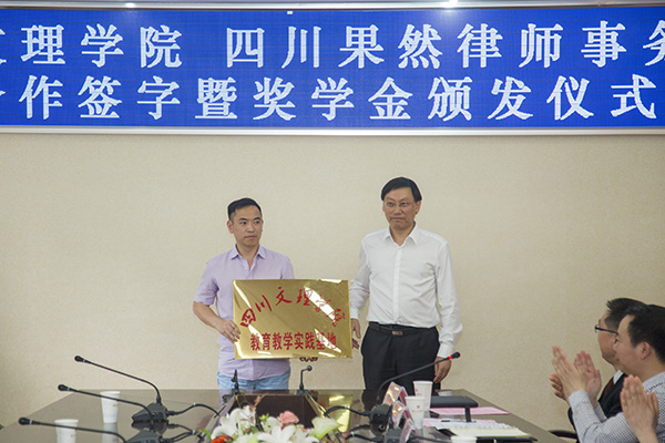 王成端代表学校向四川果然律师事务所授“ac米兰官网中文网站教育教学实践基地”牌匾。