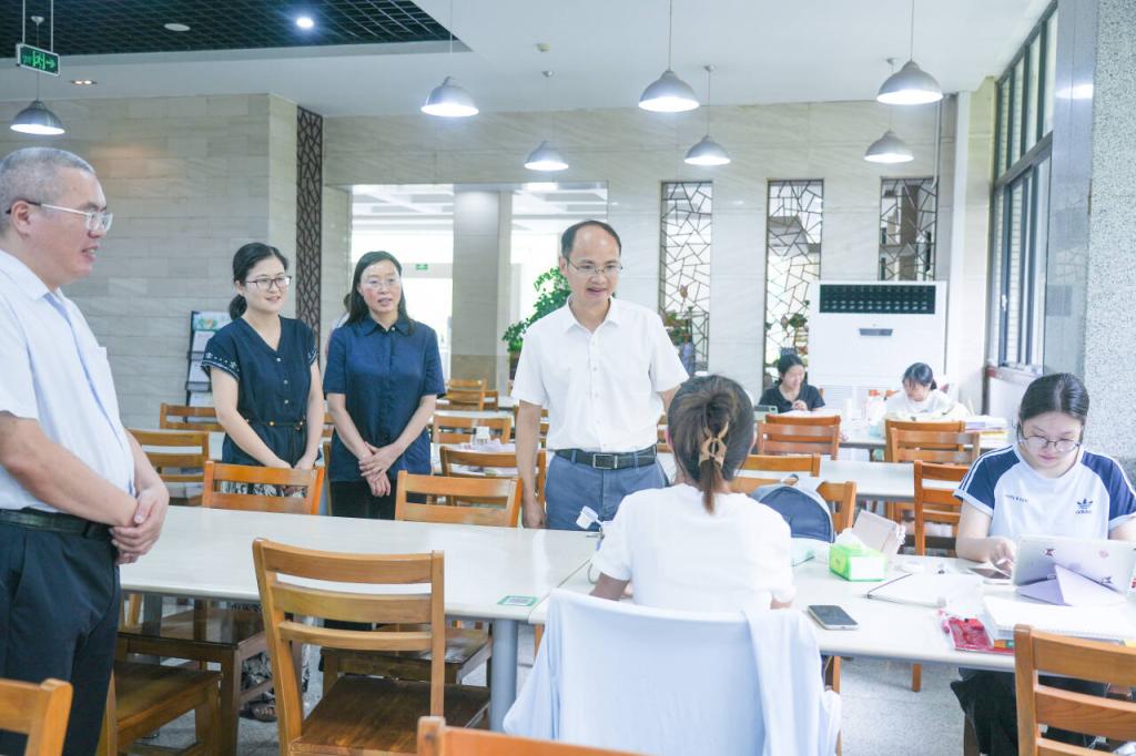 在图书馆,黄涛听取图书馆暑期工作安排汇报,与在学习的学生亲切交谈,了解大家假期留校学习生活情况,叮嘱同学们注意防暑降温、合理规划时间,遇到问题及时向学校反映。