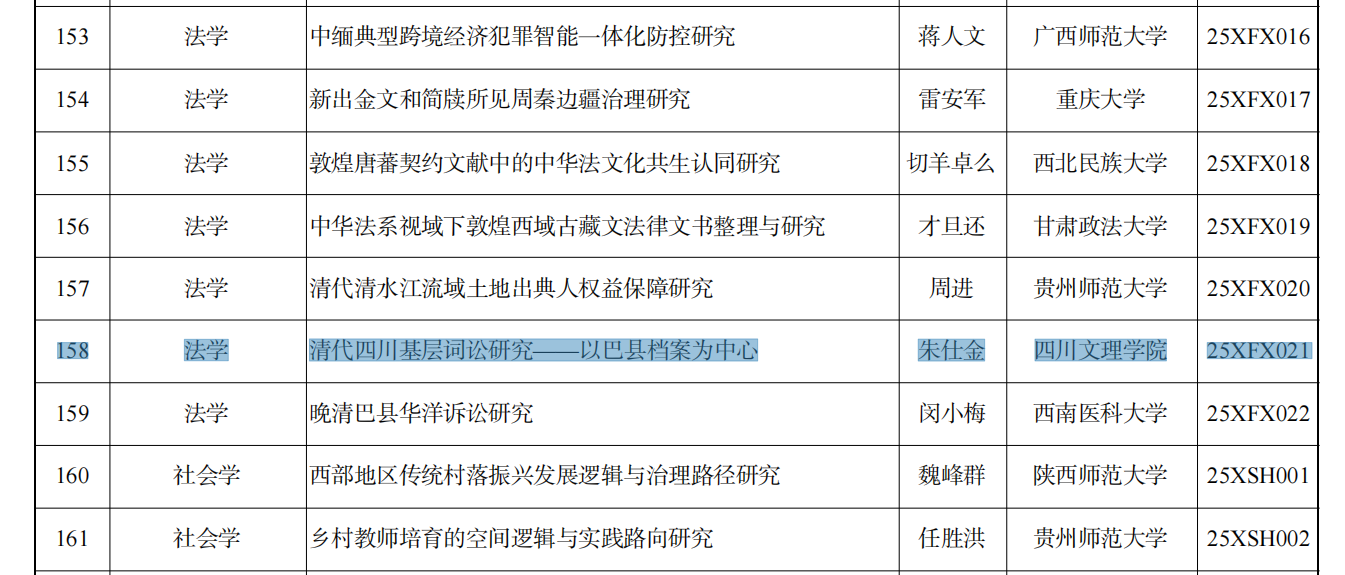 近日,全国哲学社会科学工作办公室公布了2025年度国家社会科学基金年度项目立项结果,ac米兰朱仕金博士主持的《清代四川基层词讼研究——以巴县档案为中心》(项目编号:25XFX021)获批西部项目立项。