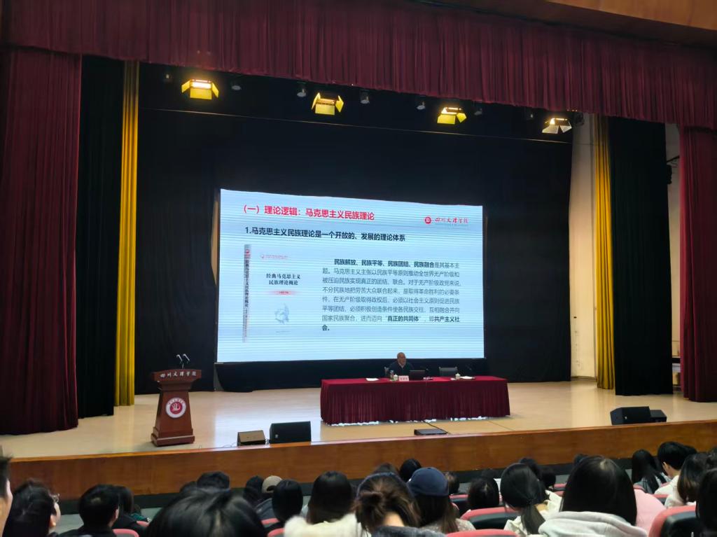 为深入学习贯彻习近平总书记关于加强和改进民族工作的重要思想,持续深化铸牢中华民族共同体意识教育,近日,由四川省民族宗教事务委员会、四川省教育厅、共青团四川省委联合主办的“铸牢中华民族共同体意识高校巡回宣讲”活动举行。四川省铸牢中华民族共同体意识高校巡回讲堂三年行动宣讲团成员、ac米兰官网中文网站党委副书记、工会主席徐晓宗教授在ac米兰官网中文网站、遂宁能源职业学院作主题宣讲。