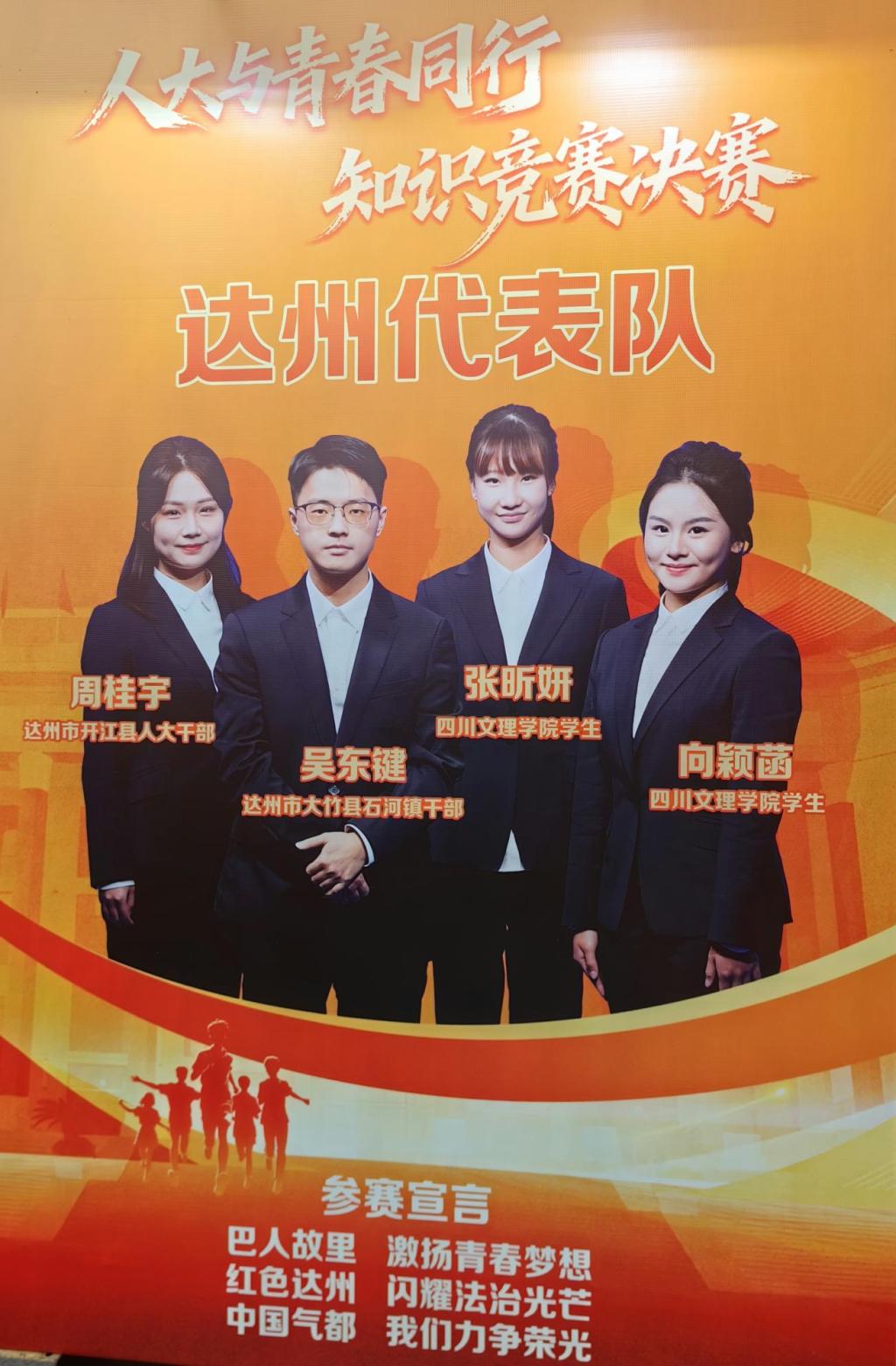 活动中,ac米兰各级团组织高度重视,精心组织全校青年学生参加“人大与青春同行”知识竞赛网络答题,引导教育青年学生了解人大制度、学习人大知识、增强民主法治意识,激励新时代川文理青年积极参与全过程人民民主实践。文学与传播学院播音主持艺术专业学生向颖菡、政法学院知识产权专业学生张昕妍作为达州代表队队员参加知识竞赛决赛并获得三等奖。