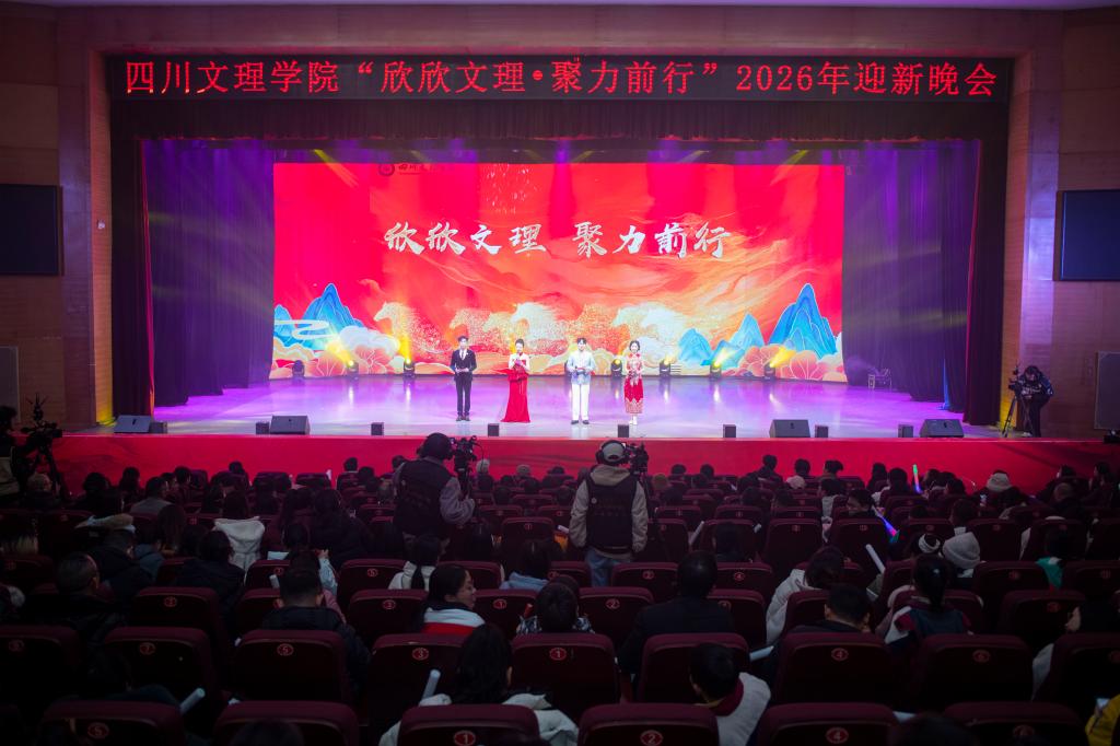 2025年12月30日晚,学校音演厅内华灯璀璨、气氛热烈,“欣欣文理 聚力前行”2026年迎新晚会在此举行。党委书记黄涛,校长侯忠明,党委副书记徐晓宗,党委副书记、纪委书记帅胤,副校长程碧英、熊兴中,以及各二级单位负责人、师生代表欢聚一堂,共迎新年。