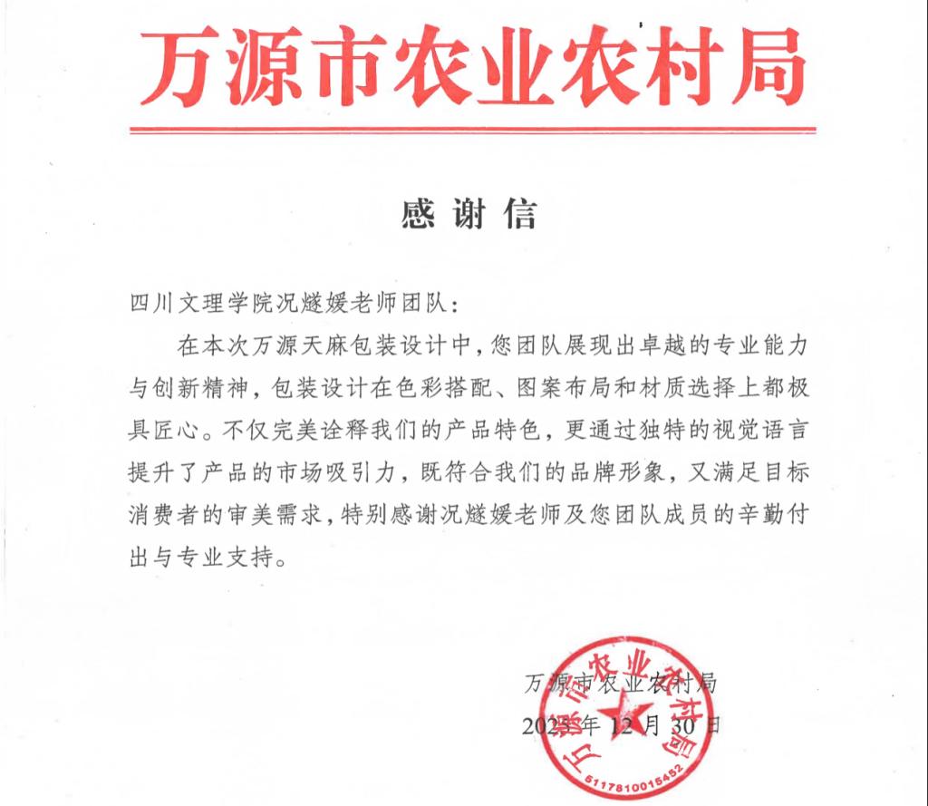 近日,万源市农业农村局向ac米兰美术学院况燧媛老师团队发来感谢信,对其在万源天麻包装设计项目中展现的专业素养与创新精神给予高度赞誉。这一成果,既是团队专业能力的生动彰显,更是ac米兰扎实推进帮扶工作、赋能乡村振兴的又一具体实践。