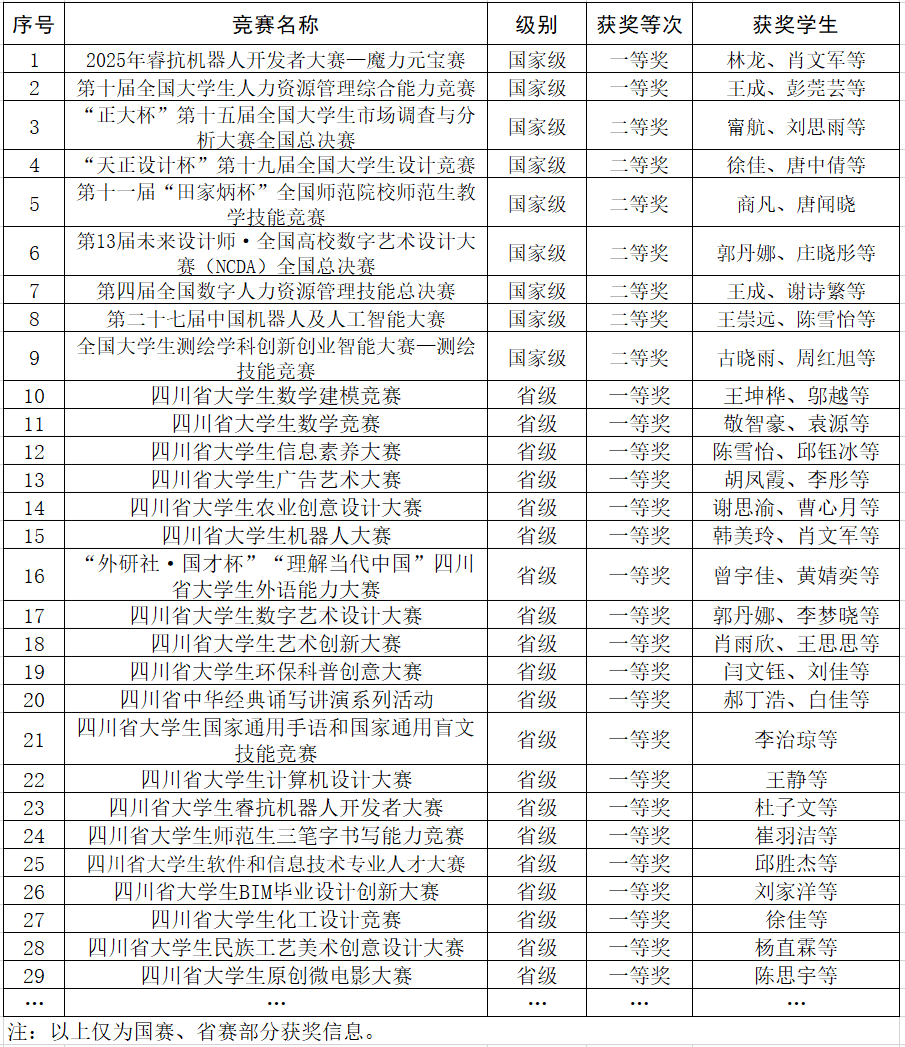 学校始终将学科竞赛作为提升人才培养质量的重要抓手,持续健全“以赛促学、以赛促教、以赛促改、以赛促质”的长效机制,极大激发了学生的创新能力。除了参加省赛,ac米兰师生还积极参与国家级竞赛,2025年在睿抗机器人开发者大赛、全国师范生教学技能竞赛、中华经典诵写讲演大赛等国家级竞赛中获奖60余项,充分展现了扎实的专业素养与综合能力。同时,学校积极承办四川省大学生光电设计竞赛、四川省大学生睿抗机器人开发者大赛,进一步彰显了学校在创新人才培养方面的扎实成效与良好声誉。