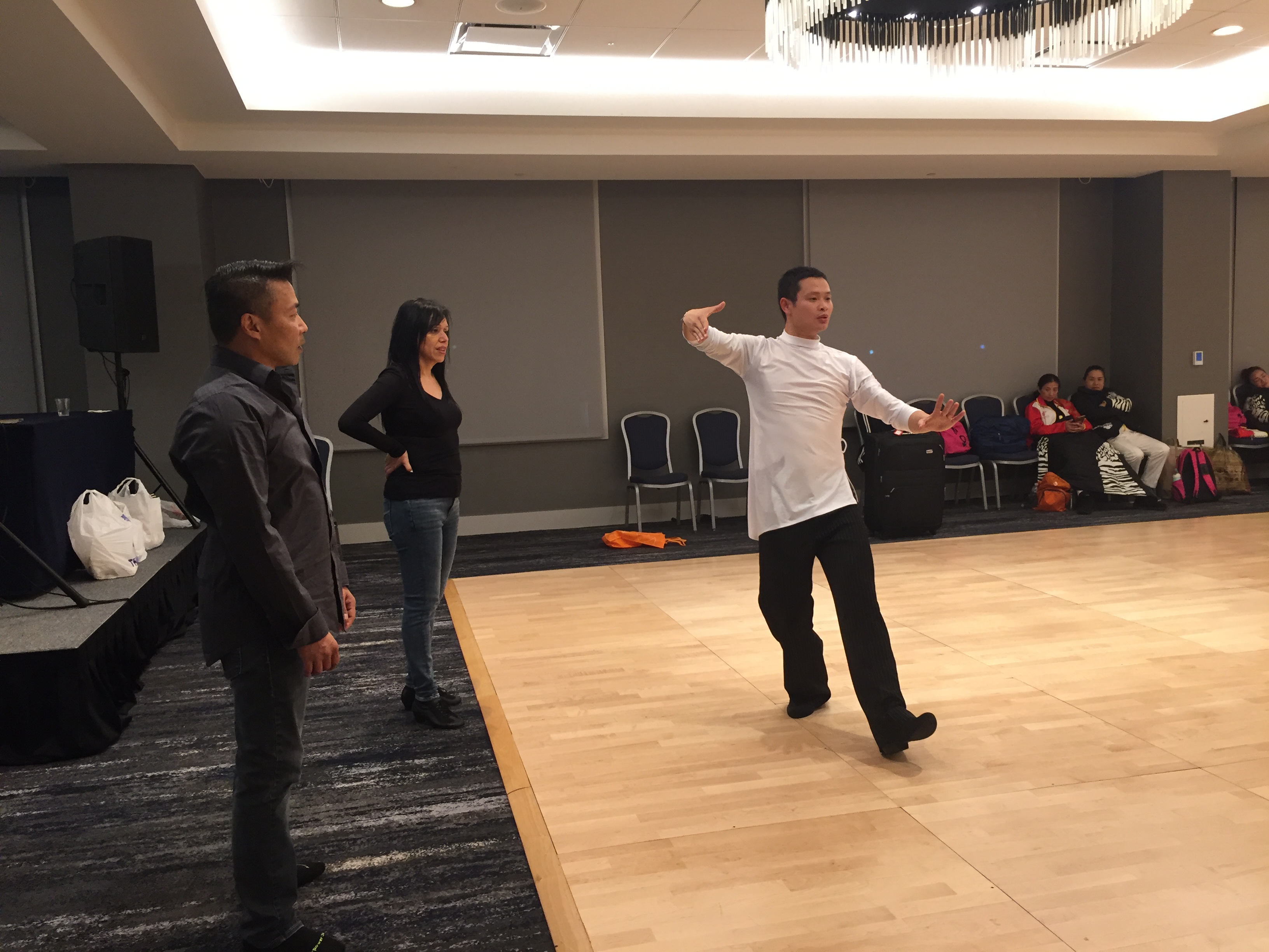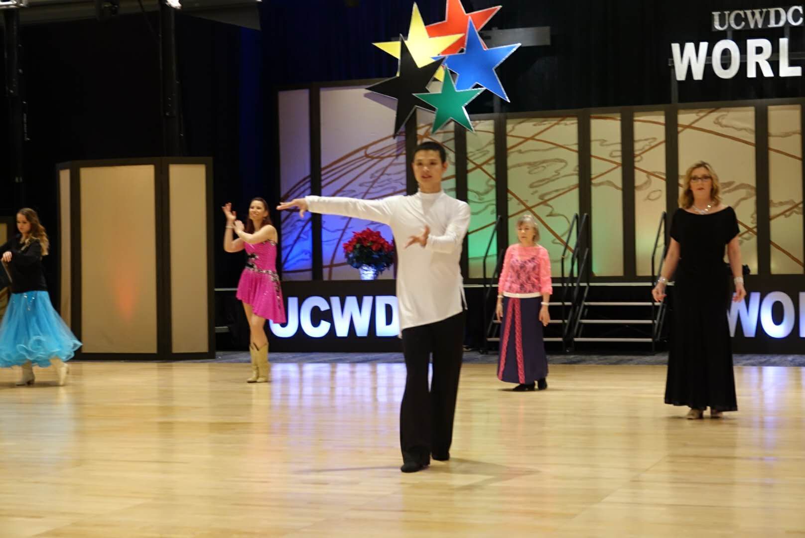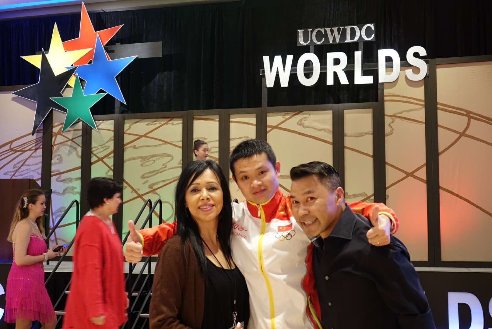2017年12月29日在学校的大力支持下,冉卫东老师前往杭州与湖南队汇合,由中国代表团团长全国排舞广场舞推广中心常务副秘书长单缨女士带队赴美国参加比赛,此行一共13人。到达美国后,即在赛事组委会的组织下进行高强度培训和赛前训练。冉卫东老师说:“每天从下午两点一直训练到晚上十二点,训练强度很大,还要调整时差,所以每天只能睡2个小时,精神状态急剧下降。但想到能在世界排舞的舞台上与各国选手进行交流,心情既紧张又激动,我把这种亢奋状态一直保持到比赛结束。”临赛前,全国排舞广场舞推广中心常务副秘书长单缨女士还专程请来两位国际排舞大师Rosy老师和Sam老师为冉老师作指导。