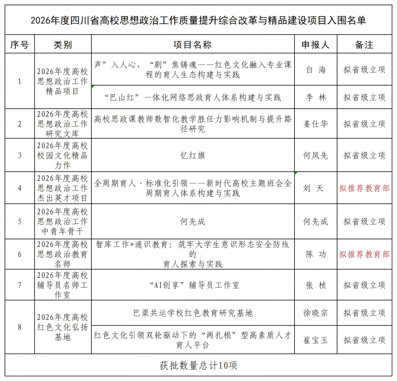 本次获批项目特色鲜明、成效突出。“‘声’入人心,‘剧’焦铸魂——红色文化融入专业课程的育人生态构建与实践”“‘巴山红’一体化网络思政育人体系构建与实践”等项目,深耕川陕革命老区红色文化特色资源,推动思政教育与专业教育、网络空间深度融合,创新育人模式新生态;“高校思政课教师数智化教学胜任力影响机制与提升路径研究”“‘AI创享’辅导员工作室”等项目,紧扣数智化发展趋势,探索科技赋能思政工作新路径;巴渠共运学校红色教育研究基地、红色文化引领双轮驱动人才育人平台等项目,聚焦打造红色育人阵地,健全长效育人机制;杰出英才、中青年骨干、思政教育名师等人才类项目,强化思政工作队伍梯次建设,为思政工作高质量发展提供坚实人才支撑。