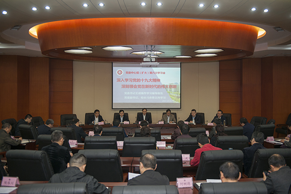10月25日,学校在莲湖校区举行题为《深入学习党的十九大精神,深刻领会党在新时代的伟大创新》的党委中心组(扩大)学习会,学校党委书记王成端为与会人员作学习辅导报告,会议由校长刁永锋主持。党委副书记侯忠明、雷超,副校长李壮成、朱兴华出席,党委中心组成员,全校正处级(含主持工作)干部参加了会议。