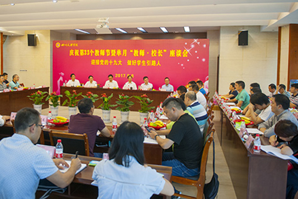 9月8日下午,以“迎接党的十九大,做好学生引路人”为主题的庆祝第33个教师节暨单月“教师·校长”座谈会在莲湖校区举行,党委书记王成端、校长刁永锋出席并讲话,党委副书记侯忠明、雷超、副校长李壮成、朱兴华出席会议并为从事高等教育工作满三十年的教师颁发荣誉证书和纪念品。