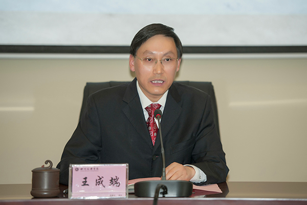 校长王成端作《强化档案意识  推进规范建设——努力提高档案为学校改革发展服务的能力和水平》讲话。他说档案工作会在档案工作面临“四个全面”战略布局、国家大数据发展战略和“互联网+”行动推进计划的新形势下,在省教育厅、省档案局对高校档案管理在理念、技术、方法及模式上提出新要求的重要时点背景下筹备召开,具有重要意义。他要求全校相关部门及档案工作者在工作中要凝聚共识,明确责任,不断强化档案意识;依法治档,规范管理,使档案馆成为支撑学校改革发展的资源中心;档案管理部门要加快推进信息化建设,加强安全防范,实现档案信息安全共享;同时,还要加强档案宣传,参与文化建设,展现档案文化魅力。他希望相关部门及档案工作人员要认真履行“为党管档、为校守史、为民服务”的职责,努力提高档案为学校改革发展服务的能力和水平,为学校建设作出新的贡献。