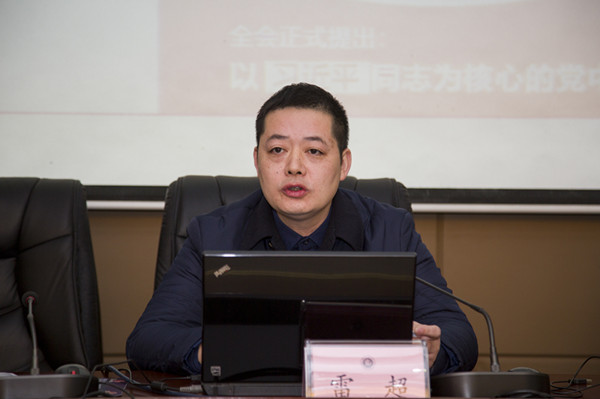 雷超结合党的十八届六中全会公报,重点解读了《条例》和《准则》的重要意义、主要特点,并从路线、着力点、任务、对象和目的等方面详细讲解了具体内容。他还就推进全面从严治党巩固发展良好政治生态进行专题宣讲,介绍当前党风廉政建设面临的形势、任务和重点工作。他希望,全体党员干部务必保持对党忠诚的政治品格、务必落实管党治党的政治责任、务必秉持为民服务的政治情怀、务必坚守清正廉洁的政治操守,当好全面从严治党的领导者、实践者,在自身廉洁方面走在前头、当好表率。