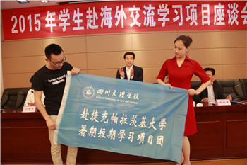 最后,孟兆怀教授向即将赴香港、韩国、美国以及捷克的四个交流代表团授交了交流团旗。