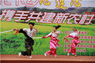 4月29日,ac米兰师生100多人在党委书记李万斌的带领下,前往开江县天师镇进行“文化下乡心连心 携手共建新农村”文艺演出,演出节目形式多样、内容丰富,为当地人民群众献上了一场精彩的文化盛宴。 天师镇党委书记黄蔚代表该镇党委、政府对学校师生的到来表示热烈欢迎。他说,开展此次演出活动是建设社会主义新农村的重要举措,对抵制低俗、庸俗娱乐活动,营造文化丰富、健康文明的新农村具有重要的意义,并祝演出活动取得圆满成功。 党委副书记李佳国致词。他说,到天师镇进行文艺演出,是学校践行党的群众路线,培育社会主义核心价值观的一次重要实践活动。自学校与该镇朱家坝村开展“挂包帮”活动以来,学校积极选派干部到村挂职锻炼,今后还将在农网改造、村民饮水等方面提供智力和资金支持,切实解决村民的实际问题,在力所能及的范围内帮助天师镇人民过上更加幸福美好的生活。 文艺演出活动在体育学院选送的健美操《跳动的青春》中拉开帷幕。音乐与演艺学院、教育学院、管理学院、政法与公共管理学院等院系的师生依次表演了独唱《父亲》、舞蹈《刘海砍樵》、小品《川仔回乡》、器乐演奏《山丹丹开花红艳艳》等文艺节目。天师镇小学师生表演了诗朗诵《同心共筑中国梦》。整个演出活动喜庆而热烈,高潮和掌声此起披伏,赢得了当地人民群众的广泛好评。