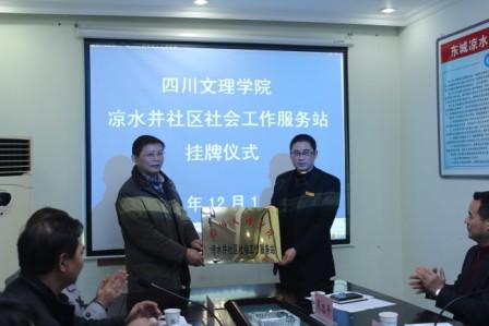 在达州市民政局牟道勇副局长、通川区凉水井社区陈传泽书记讲话后,由学校副校长王洪辉教授代表学校向凉水井社区陈传泽书记授予了“ac米兰官网中文网站凉水井社区社工服务站”铭牌。