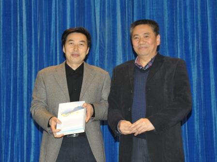 报告会最后,校长孟兆怀代表学校接受胥健主任捐赠给学院师生的二百余册诗词作品专著、专集及歌曲集DVD《放歌达州》。