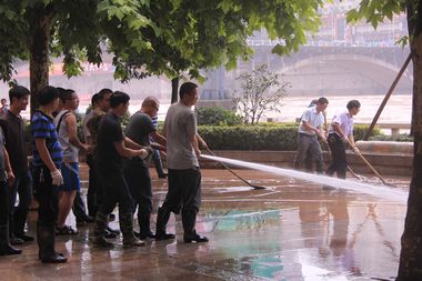 受连日来的强降雨影响,达州多地遭受洪涝灾害。5日凌晨,达城州河洪峰到达最高值,水位超过滨河路面3米左右,临河门市全部被水淹没。为响应市委、市政府号召,我院中层干部在党委副书记李佳国的带领下,赴滨河路与全市机关各部门同志一道参加清淤工作。
