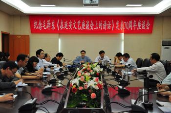 5月22日,我院在行政楼三楼会议室隆重举行纪念毛泽东《在延安文艺座谈会上的讲话》发表70周年座谈会。院党委书记李万斌教授、院长孟兆怀教授、副院级调研员成良臣教授出席座谈会,院宣传部、科技处、教务处、高等教育研究所、学报、四川革命老区发展研究中心等部门负责人,中文、音乐、美术、体育、初教、文化传媒等系的负责人以及中文系全体教师和学生社团的负责人参加座谈会。