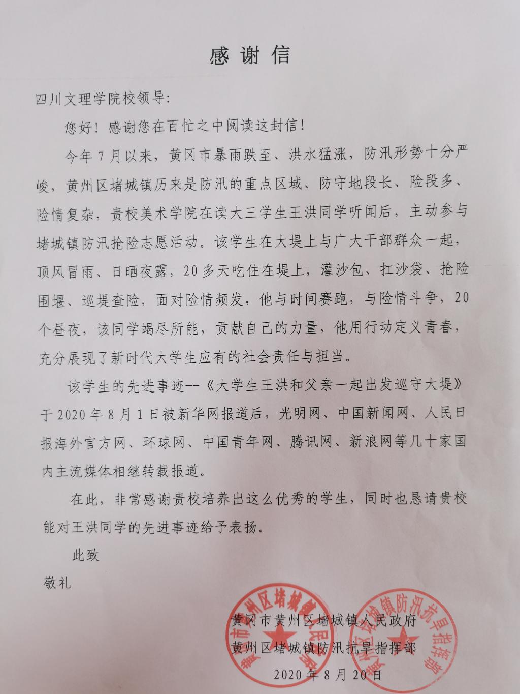 9月26日上午,黄冈市黄州区堵城镇人民政府、黄州区堵城镇防汛抗洪抗旱指挥部向学校寄来感谢信,对ac米兰美术学院大三学生王洪同学在家乡踊跃参与抗洪抢险,勇于担当奉献,面对灾情冲锋在前的积极表现予以感谢与称赞。