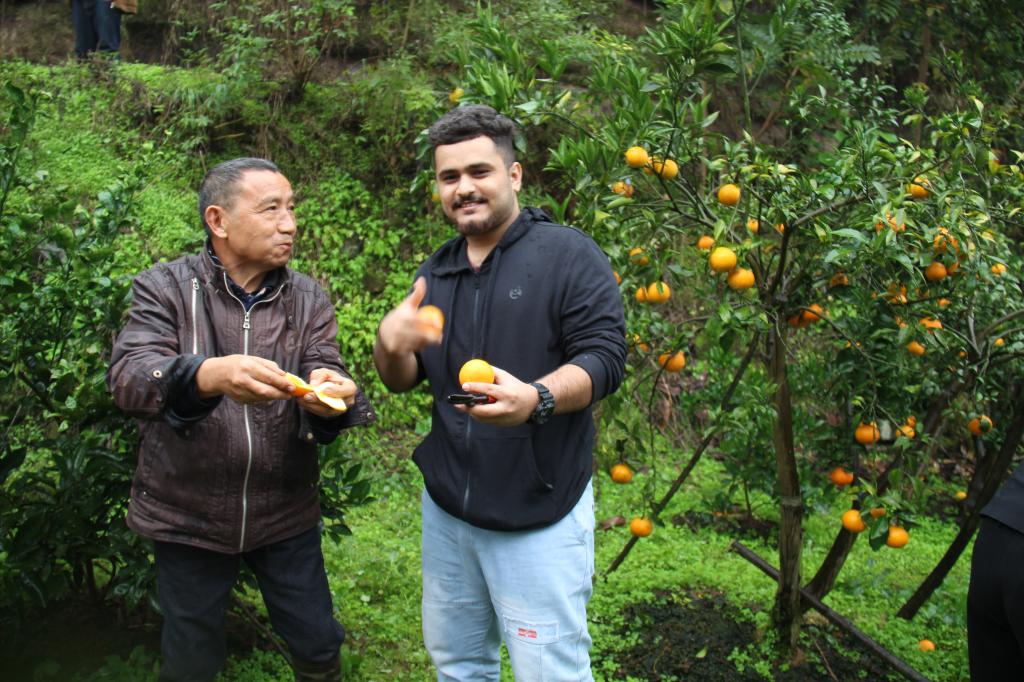 外籍师生聆听赵家镇桂花村村委书记田建军关于该村的基本情况、产业发展及整体发展规划的介绍,参观桂花村的万亩橘园种植基地,体验采摘乐趣,品尝香甜可口的橘子。他们感叹这些农作物和科技的结合,通过科学的培养技术方法,橘园呈现出硕果累累的景象。