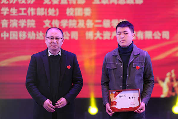 晚会现场,为了表彰龙登浩同学在12月21日晚,救助公交车司机的先进事迹,达州市公交公司党委副书记、总经理余永立现场为龙登浩颁发“新时代,新青年”荣誉证书,勉励文理学子继续传递正能量,争当新时代新青年。