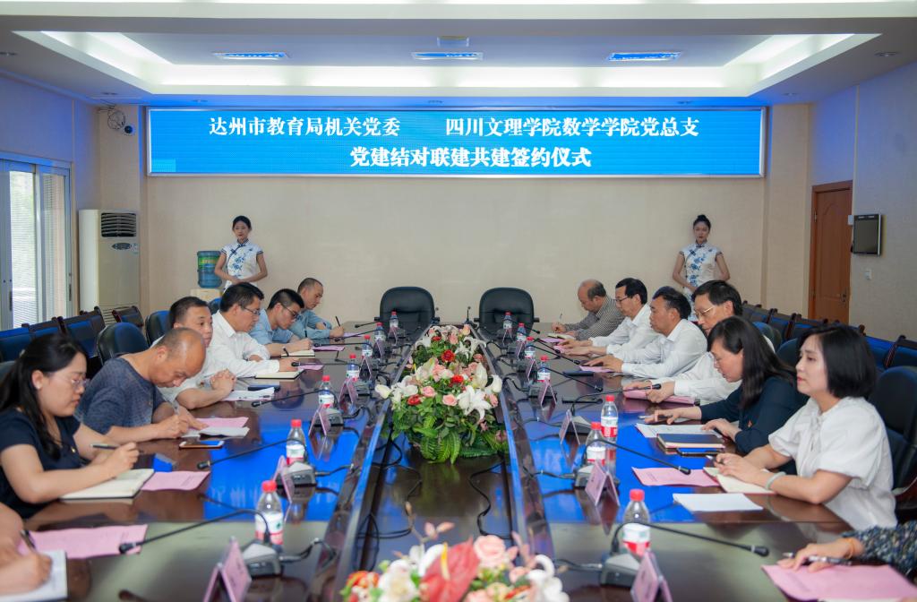 为认真践行新时代党的建设总要求,推动基层党建工作实现高质量发展。5月20日下午,ac米兰官网中文网站数学学院党总支与达州市教育局机关党委党建结对联建共建签约仪式在莲湖校区举行。学校党委书记王成端,党委组织部部长涂德祥,达州市委教育工委书记、市教育局党委书记、局长陈军,市教育局党委委员、机关党委书记蒋伟出席会议。副校长邓杰主持签约仪式。