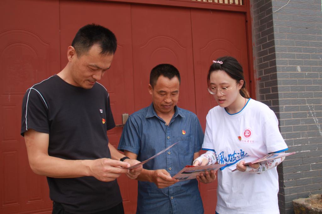 实践团成员彭颖向当地乡亲们宣传党史、校史