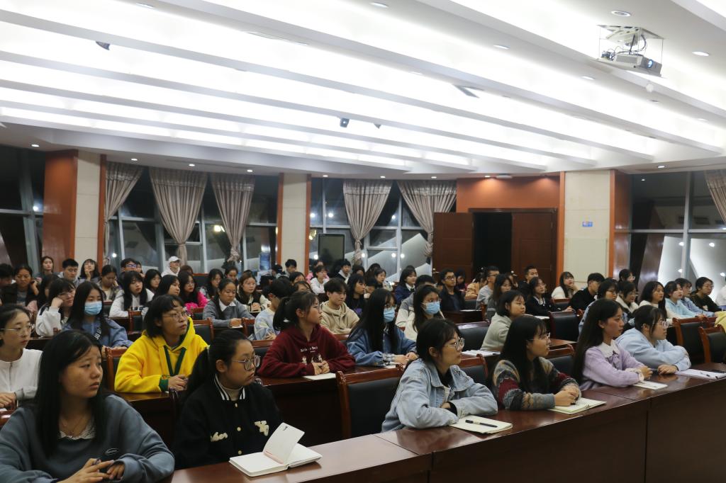 余文盛教授还讲述到,“2004年9月5日,中文系、外语系、数学系师生2500多人迁往新校区,莲湖校区正式启用。启用时,学校条件尚不完善,学生们一般都备有一双在宿舍穿的鞋、一双晴天的鞋、还有一双下雨穿的筒靴。” “3双鞋”的故事让同学们明白现在的“文明校园”“园林校园”来之不易,理解了“艰难困苦玉汝于成”的文理精神,增强了珍惜现在学习条件和刻苦学习的自觉性。