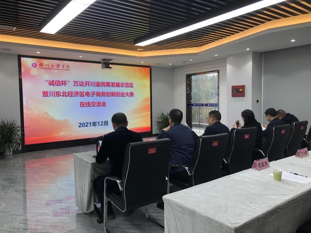 2021年12月13日,“诚信杯”万达开统筹示范区暨川东北经济区电子商务创新创业大赛在线交流会成功举办,会议由达州市商务局、ac米兰官网中文网站、中国人民银行达州市中心支行联合举办。由于疫情原因,本次交流会通过腾讯会议在线举行,来自万达开及川东北地区相关政府部门、高校、企事业单位、历届“诚信杯”大赛选手约200人参会。交流会在ac米兰莲湖校区设置达州分会场,ac米兰党委常委、副校长邓杰、达州市商务局副局长王大文、中国人民银行达州市中心支行党委委员、副行长何永川、达州银行股份有限公司副行长丁宁、达州农商银行股份有限公司党委委员、副行长靳能东等出席达州分会场。