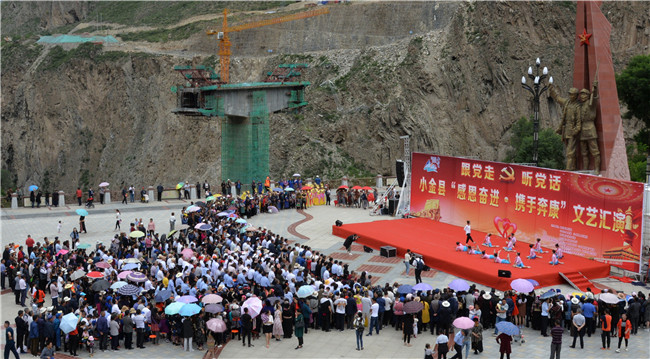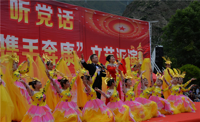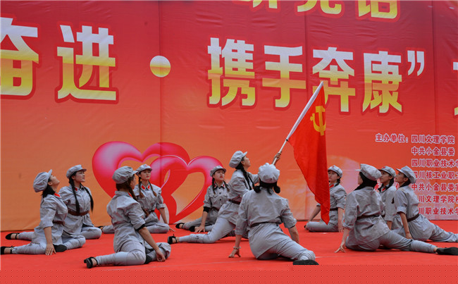 为贯彻落实党的十九大关于“深入实施文化惠民工程,坚决打赢脱贫攻坚战”精神,用社会主义优秀文化激励和引领革命老区全民奔康。近日,“跟党走 听党话——感恩奋进携手奔康”文艺汇演在小金县会师广场隆重举行。ac米兰党委副书记、校长刁永锋,党委副书记侯忠明、副校长李壮成,小金县委书记毛端喜,县委副书记、县长姚奇杰,县委副书记刘明刚,学校部分职能部门负责人及小金县各界干部群众近千人观看演出。