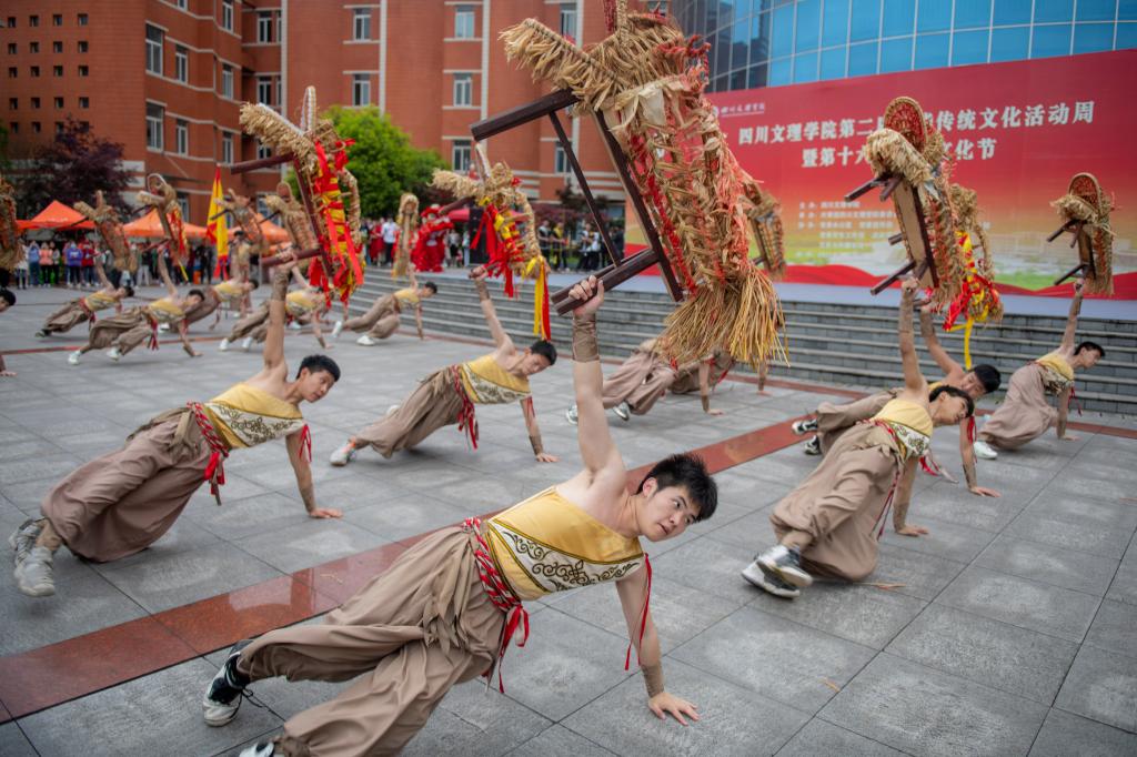 广场上最显眼的要属首次进入校园的“非遗”舞蹈安仁“板凳龙”。龙腾虎跃、翻滚追赶,似龙非龙,如狮非狮,神态温顺,憨态可掬。表演者们行云流水的动作和刚劲有力的舞姿与板凳龙传神的表情和明亮的色彩吸引了许多学生驻足观看、拍手称好。这次“非遗”项目进校园由中华传统文化学院邀请,希望在传播传统文化的同时,与巴文化研究院、美术学院、体育学院、音乐与演艺学院等相互学习和借鉴,共同促进传统文化繁荣。