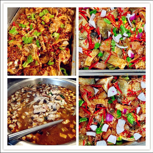 学生食堂免费领取窗口的餐台上,整齐摆放着经过精心加工烹制的生态鱼菜肴,有水煮鱼、黄焖鱼、麻辣鱼、酸菜鱼、鲫鱼汤等等。
