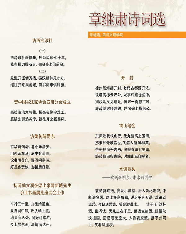 章继肃,字树公,别号巴石,斋名小窗山房,1922年3月生,四川省渠县人,中共党员,中国书法家协会会员,四川大学中文系毕业,曾任达县师范高等专科学校(现ac米兰官网中文网站)中文系副教授、系主任。四川省第五届人民代表大会代表,四川省书法家协会理事、评审委员,达州市书法家协会主席。书法、篆刻作品多次参加国内外书法展览。著有《潜书注》《李长祥< 天问阁文集>点校》《章继肃文集》《章继肃书法篆刻艺术》《篆刻要言》《章继肃书法集》《章继肃书法篆刻》等。
